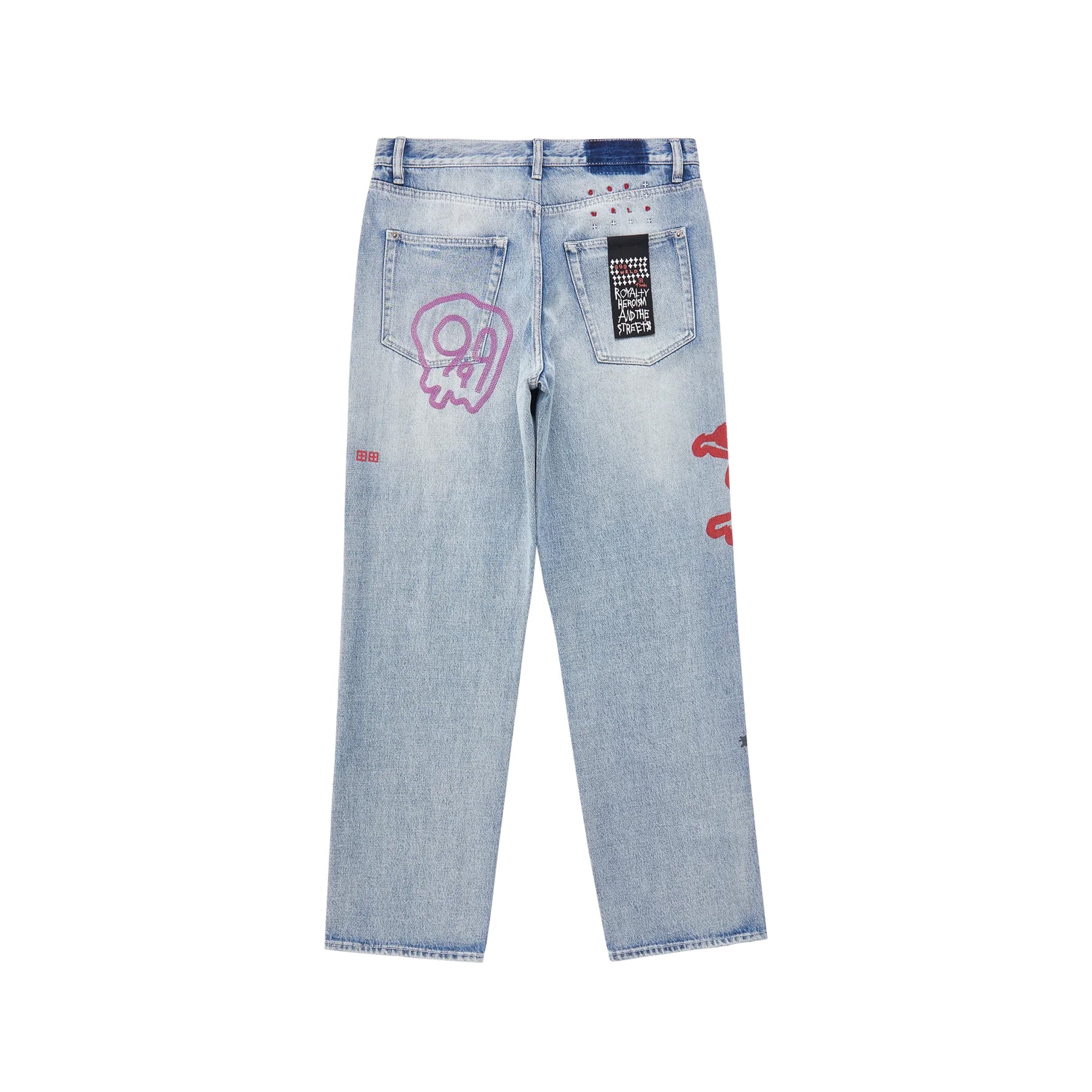 THE ANTI K JUICE TRIP ARE A MID-RISE, RELAXED STRAIGHT FIT WITH A REGULAR LEG OPENING AND HEAVY STACKING. MADE FROM A PREMIUM RIGID DENIM IN A MEDIUM INDIGO FADED WASH. FEATURES MULTIPLE SCREEN PRINTS AND EMBROIDERY OF ORIGINAL JUICE WRLD AND KSUBI ARTWORK, LIGHT SEAM GRINDING, GHOST BACK PATCH AND CLASSIC KSUBI BRANDING.